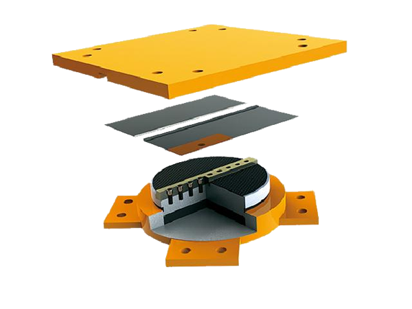 由上支座板、球冠球冠襯板、球面四氟滑板、下支座板組成。通過球冠襯板和球面四氟滑板以及球冠襯板和上支座板的相對滑動,共同實現(xiàn)上部結(jié)構(gòu)的萬向轉(zhuǎn)動。特適用于大噸位、大轉(zhuǎn)動、大跨度的建筑結(jié)構(gòu)。